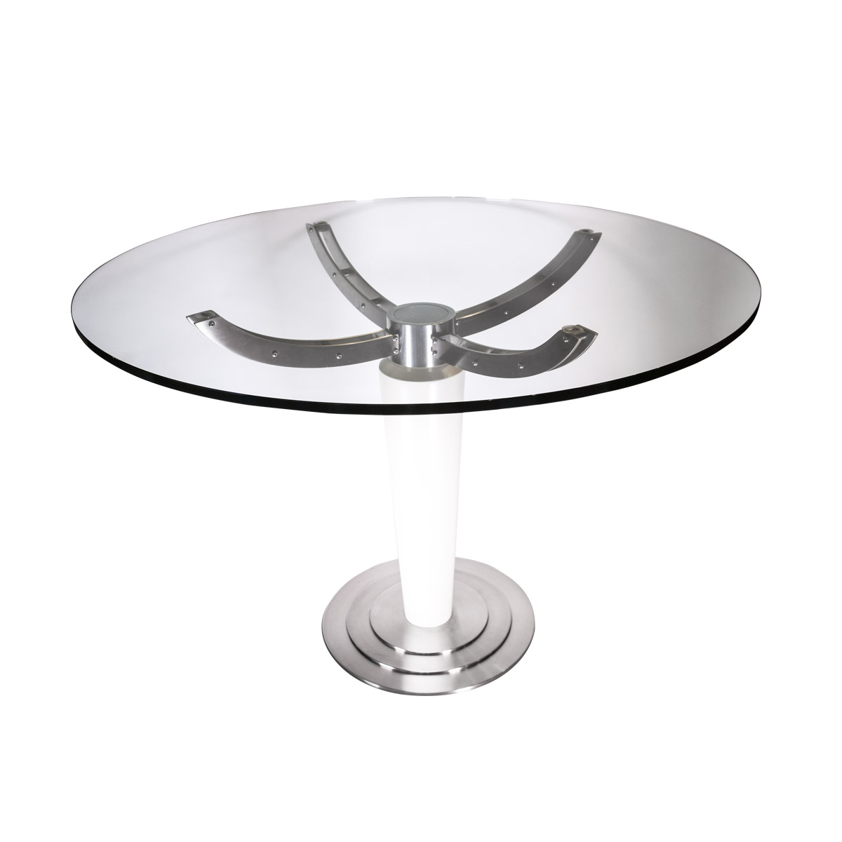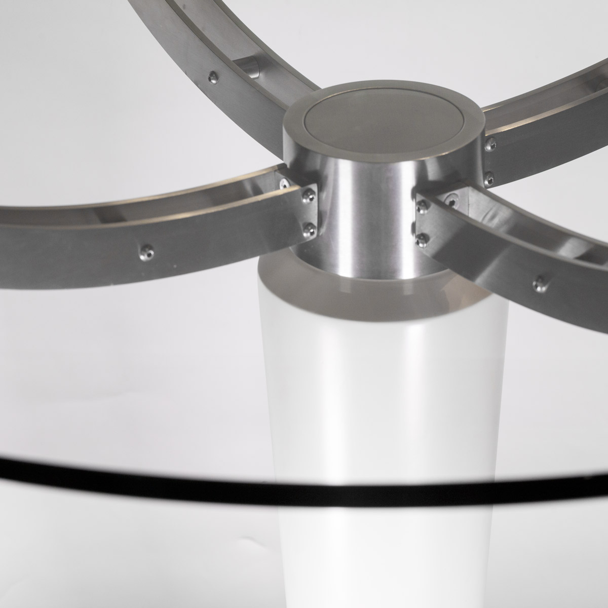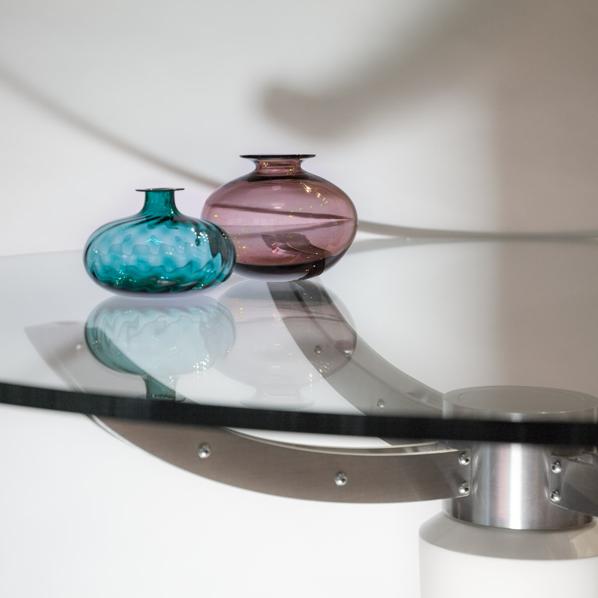 Ogni oggetto, mobile o complemento d'arredo, è progettato tenendo conto della funzione che andrà ad assolvere, affinchè sia di semplice realizzazione e massima resa estetica. Questo tavolo, per esempio, è stato realizzato con corpo centrale in acciaio satinato, legno laccato e con piano in vetro temperato: elementi che gli conferiscono leggerezza ed eleganza, ma nello stesso tempo stabilità e robustezza.