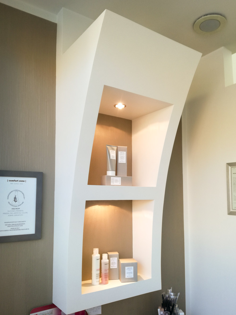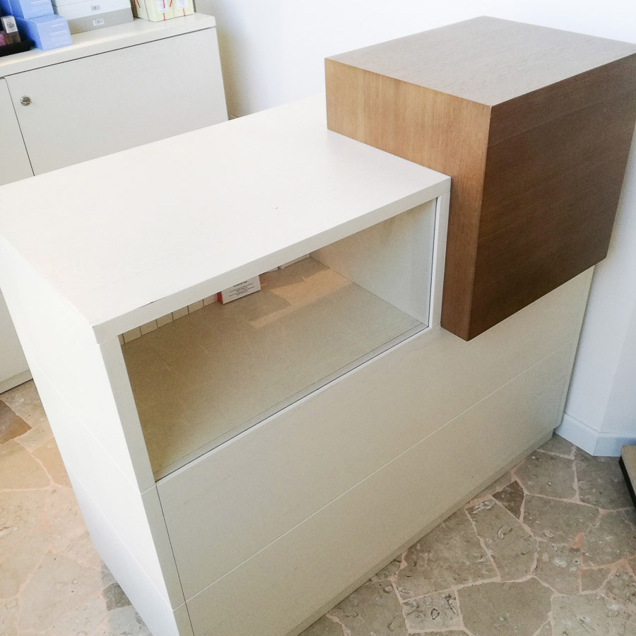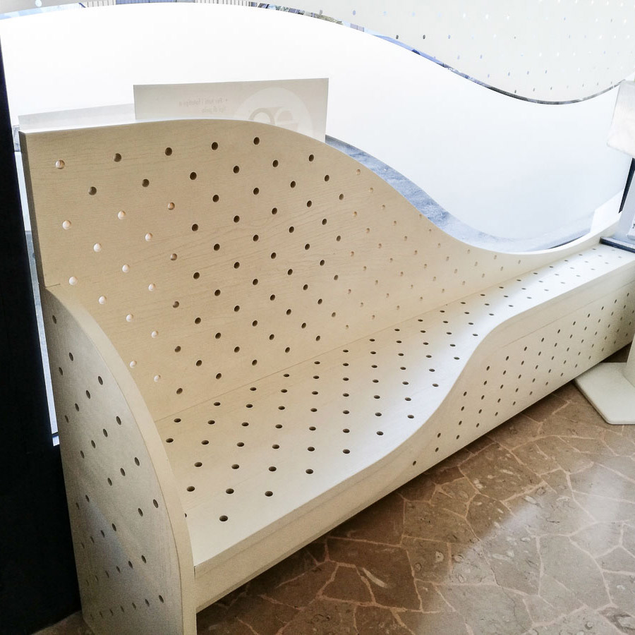Panca realizzata su disegno, in legno laccato opaco, traforata con macchina a controllo numerico, al fine di alleggerirne visivamente l'impatto e permettere di far passare oltre alla luce, anche il calore, essendo stata realizzata a copertura di un vecchio radiatore.